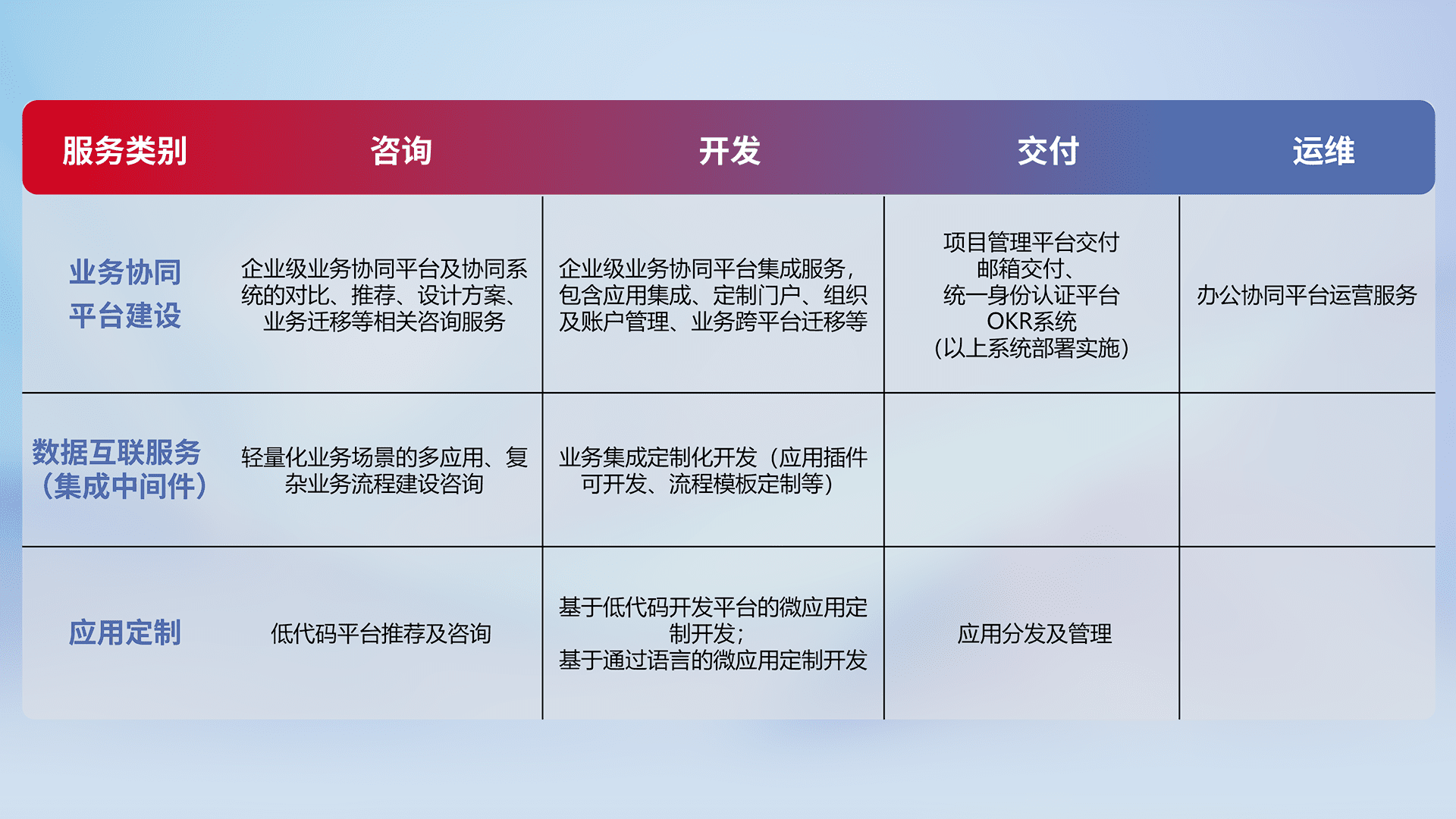 针对钉钉、、企微、、、IDaas等平台级产品提供产品的规划、、、、方案、、、交付、、定制化开发等服务,,实现如统一协同办公、、智能客户服务、、、、混合会议管理、、、智能数据查询、、等业务场景,,实现数字化转型。。。。