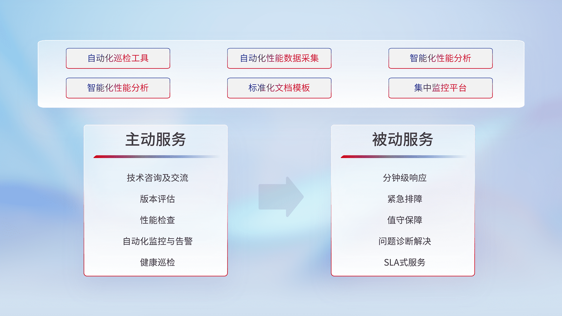 智能化工具和标准化文档,,保障服务质量,,提供主动服务(包含技术咨询、、、版本评估、、性能检查、、自动化监控与告警、、健康巡检)和被动服务包含(分钟级响应、、、紧急排障、、、值守保障、、问题诊断解决、、、SLA服务)。。。。